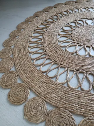 Alfombra redonda de yute con un diseño tejido intrincado. Añade un toque natural y cálido a cualquier espacio. - Material: yute - Color: beige y marrón - Forma: redonda - Diseño: tejido con motivos circulares concéntricos y borde festoneado
