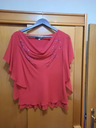 Elegante conjunto para ceremonias en talla 46. - Diseño con pedrería. - Mangas tipo capa. - Escote drapeado