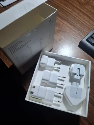 Conjunto de adaptadores de corriente de viaje de Apple. - Incluye varios enchufes para diferentes regiones. - Diseño compacto y portátil.