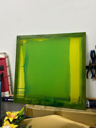 Lote de cuatro pantallas de serigrafía listas para usar. Tensas y sin arañazos ni rozaduras en el papel. Incluye paletas y material adicional. - Pantallas de serigrafía (4 unidades). - Paletas para serigrafía. - Material complementario para serigrafía: pinturas y productos