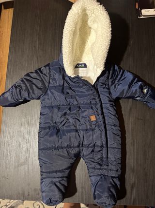 Mono polar de la marca Kiabi en color azul marino, ideal para los primeros meses. - Talla 1 mes (52-55 cm). - Interior forrado de borreguito blanco para mayor calidez. - Capucha con forro de borreguito. - Cierre frontal con cremallera. - Puños y tobillos elásticos.