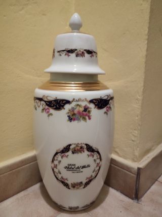 Elegante tibor de porcelana con un diseño clásico y detalles en dorado. Presenta un acabado esmaltado que realza su belleza. - Decorado con motivos florales, anillos de boda dorados y cenefas en azul marino. - Acabado brillante y liso. - Incluye tapa a juego. Está en perfectas condiciones.
