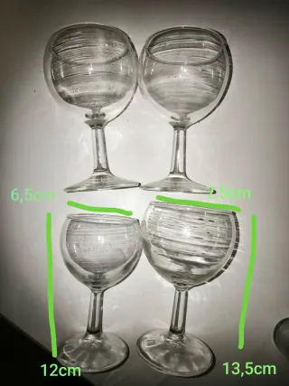 Set de cuatro copas de cristal transparentes. - Altura aproximada: 12 cm y 13,5 cm. - Diámetro aproximado: 6,5 cm y 7,5 cm.