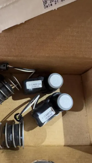 Conjunto de sensores de aparcamiento para Toyota Land Cruiser. - Incluye varios sensores con sus respectivos muelles y cables. - Etiqueta con código 'Cod. 11CQ0161A' y fecha '21.09.20'.