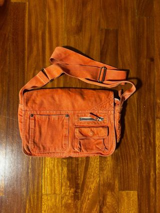 Bolso bandolera de color naranja, ideal para llevar tus esenciales. - Diseño con múltiples bolsillos frontales. - Cierre de cremallera en uno de los bolsillos. - Correa ajustable para mayor comodidad.