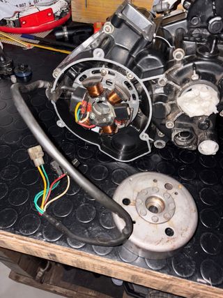 Componentes de encendido para moto marca Ducati. Se incluyen el estator con sus bobinas y el volante magnético. - Estator con bobinas de cobre. - Volante magnético con imanes. - Cableado con conector.