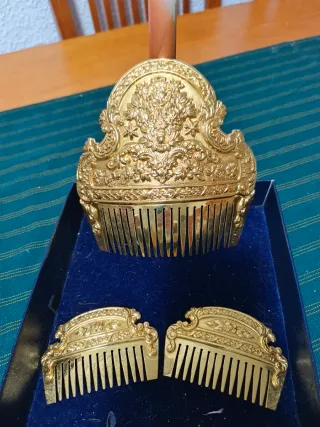 Conjunto de tres peinetas doradas, ideales para trajes regionales. - Diseño elaborado con detalles. - Acabado brillante. - Incluye una peineta grande y dos pequeñas.