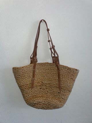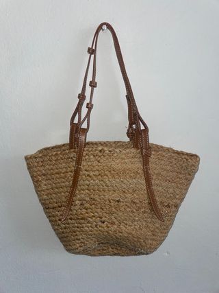Bolso de mano de Zara para mujer, con un diseño tejido y asas de piel. - Material principal: yute. - Detalle de asas y costuras en piel. - Color marrón.