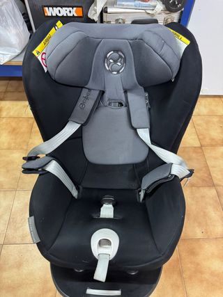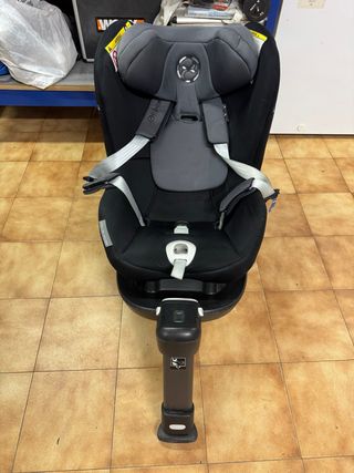 Silla de coche para bebé de la marca Cybex, con base giratoria. - Color negro y gris. - Sistema de arnés de 5 puntos. - Reposacabezas ajustable.
