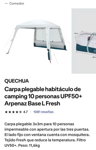 Carpa plegable de camping para 10 personas, ideal para protegerse del sol y la lluvia. Cuenta con tres puertas de acceso y ventanas con mosquitera. - Medidas: 3x3m - Filtro UV50+ - Tejido Fresh que reduce la temperatura - Peso: 11,6kg Nueva a estrenar nunca se a isado, ni siquiera se a sacado de la bolsa