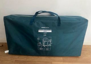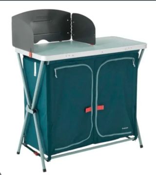 Mueble de cocina plegable para camping de la marca Quechua. Ideal para organizar tus utensilios y alimentos al aire libre. - Estructura de metal y plástico. - Tejido resistente en color verde azulado. - Incluye pantalla protectora. Solo se a montado dos veces y dentro del avance