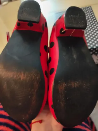 Preciosos zapatos de flamenca para niña, con un divertido diseño de lunares rojos y negros. - Talla 27. - Cierre de hebilla. - Diseño de lunares.