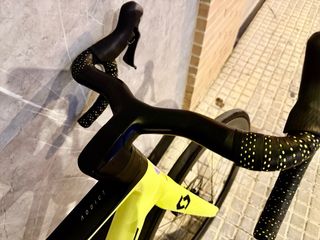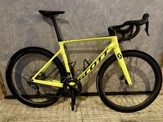 Bicicleta de carretera Scott Addict RC en color amarillo. - Cuadro y horquilla de carbono. - Frenos de disco. - Ruedas de perfil. - Manillar integrado. -Grupo mecanico de 11 velocidades Ultegra. Platos 52-36 Piños 11-32 La Bici se puede comprar con ruedas de perfil de carbono 2700€ o con ruedas de aluminio 2200€
