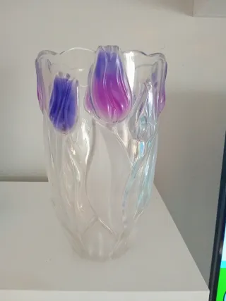 Elegante jarrón con un diseño floral. - Acabado en cristal. - Detalles en tonos morados y transparentes. - Forma ondulada en el borde.
