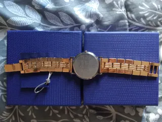 Elegante reloj de pulsera con un diseño clásico. - Esfera blanca con detalles dorados. - Correa de eslabones dorados. - Ventana de fecha.