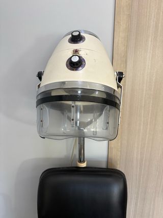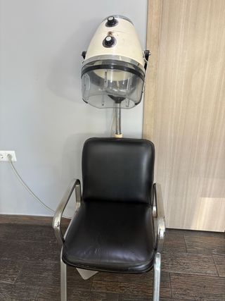 Secador de pelo profesional con asiento incorporado. Ideal para salones de belleza o uso personal. - Secador con acabado en beige y negro. - Asiento cómodo y funcional.