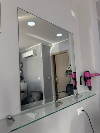 Espejos ideal para salones de belleza o barberías. Hay 2 espejos de 90x90. Estanteria de cristal tambien hay dos de 1,43 de largo y 22 cm de ancho cada uno.