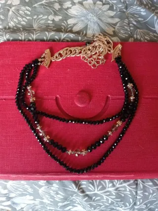 Elegante collar de varias vueltas con cuentas negras y detalles dorados. - Diseño multicapa. - Cierre de cadena ajustable.