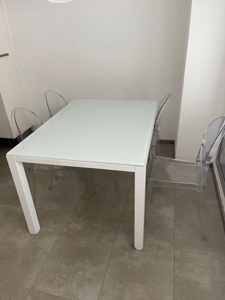 Mesa de cocina extensible con hoja de cristal y madera, acompañada de sus 4 sillas de plástico duro transparente. Mesa muy robusta y diseño extensible para mayor espacio. La hoja extensible también es de cristal En buen estado, pero con marcas de uso Medidas: 120cm largo x 90 cm ancho. La hoja extensible es de 90cm de ancho x 70cm de largo. El total de la mesa es de 190cm x 90cm