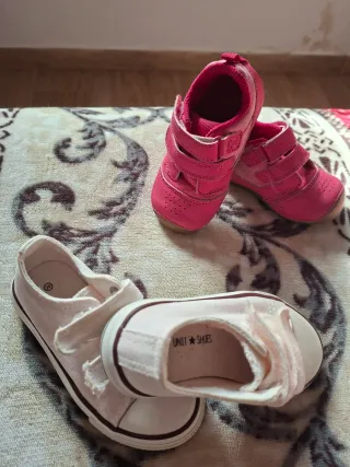 Lote de dos pares de zapatos infantiles, talla 24. - Un par de zapatillas deportivas rosas con velcro. - Un par de zapatillas casuales blancas con velcro.