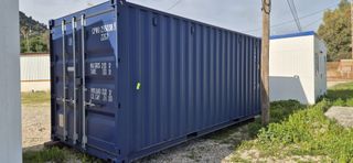 Contenedor marítimo de color azul, ideal para almacenamiento o transporte. - Puertas de doble hoja con cierres de seguridad. - Estructura robusta de acero.