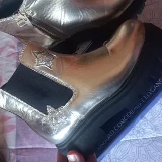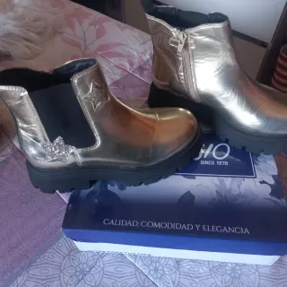 Botas de la marca Giuseppe para niños, con un diseño llamativo y moderno. - Color dorado brillante. - Detalle de estrellas decorativas. - Cierre de cremallera lateral. - Suela gruesa y resistente. Nuevas a estrenar con etiqueta