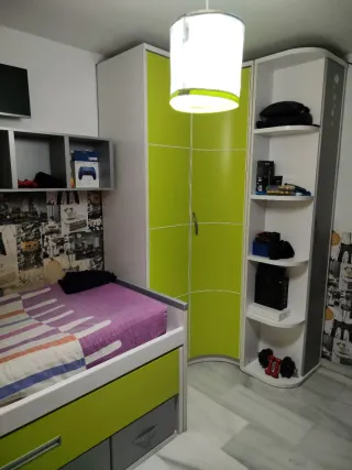 Dormitorio completo: cama, armario y estantes