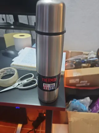 Termo de acero inoxidable de la marca Thermos. - Capacidad de 1 litro. - Mantiene bebidas calientes o frías hasta por 24 horas. - Diseño plateado y elegante.