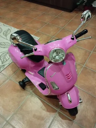 Moto eléctrica estilo Vespa en color rosa, ideal para los más pequeños. - Diseño inspirado en la icónica Vespa. - Asiento negro acolchado. - Ruedines para mayor estabilidad.