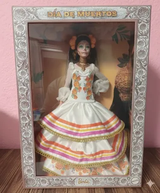 Muñeca Barbie edición especial Día de Muertos. - Diseño inspirado en la tradición mexicana. - Vestido blanco con detalles florales y cintas de colores. - Maquillaje facial de Catrina. - Accesorios temáticos.