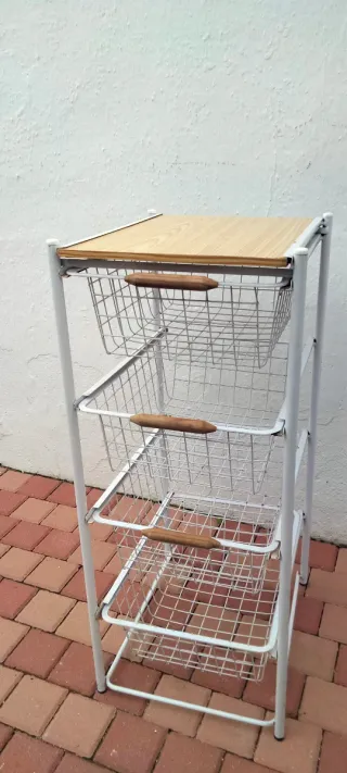 Práctico mueble de cocina con estructura metálica y cestas. - Acabado en blanco y madera. - Tres cestas metálicas con tiradores de madera. - Encimera de madera.