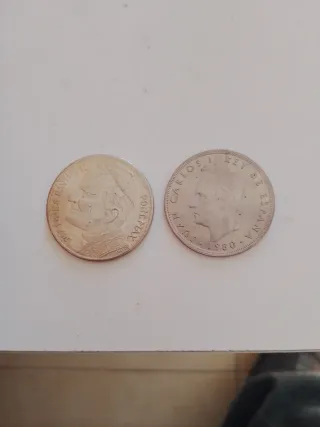 Se venden dos monedas de España. - Una moneda con la efigie de Carlos I, Rey de España, con fecha de 1980. - Otra moneda con la cara del papa