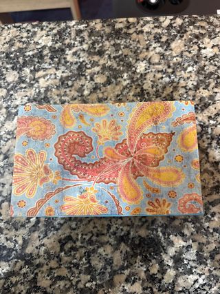 Pequeña caja de madera con un bonito diseño. - Decoración estilo paisley en tonos azules, rojos y amarillos. - Acabado rústico.