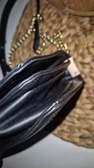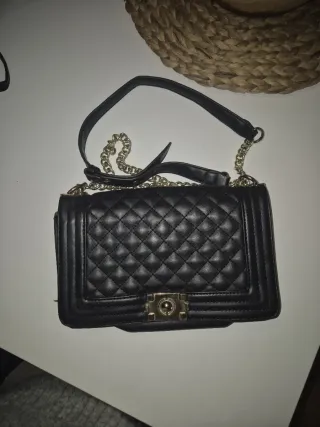 Elegante bolso negro con diseño acolchado y detalles metálicos. - Asa de cadena dorada. - Cierre de solapa con broche. - Acabado mate.
