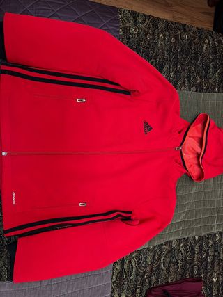 Sudadera Adidas de color rojo con capucha y detalles en negro. - Logo de Adidas en el pecho. - Tres rayas características de Adidas en las mangas. - Cremallera frontal. - Bolsillos con cremallera. - Tecnología ClimaCool.