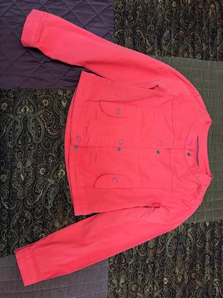 Chaqueta de color coral, ideal para añadir un toque vibrante a tu atuendo. - Diseño con cuello redondo. - Cierre de botones. - Dos bolsillos delanteros con solapa y botón.