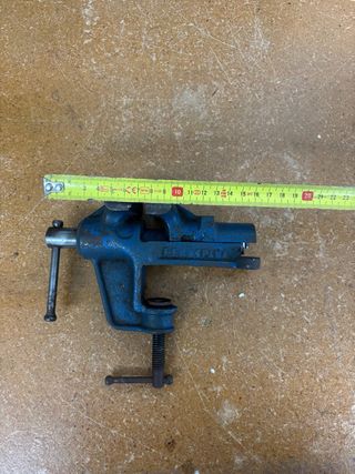 Tornillo de banco de color azul, ideal para sujetar piezas. - Construcción robusta de metal. - Mordaza ajustable con tornillo. - Base con orificios para fijación.