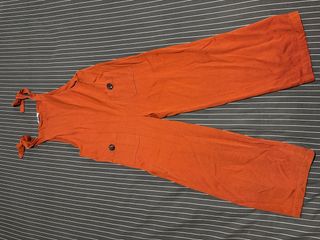 Peto largo de color naranja con tirantes anudados y dos bolsillos delanteros con botón. - Color: Naranja - Diseño: Peto largo - Cierre: Botones en bolsillos - Detalle: Tirantes anudados