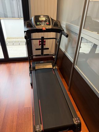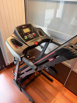Cinta de correr Fitfiu MC-400 en color negro. Diseñada para el entrenamiento en casa. - Pantalla digital. - Soporte para botellas. - Cable de seguridad rojo.