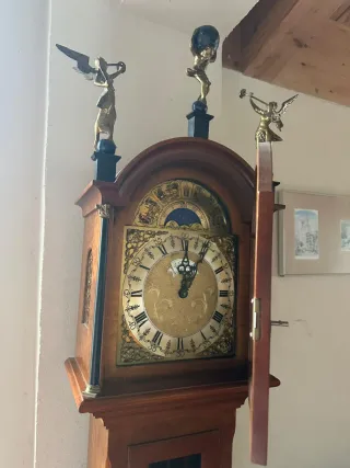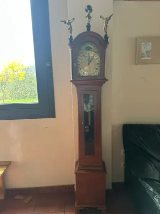 Elegante reloj de pie antiguo con detalles dorados. - Fabricado en madera. - Frontal de cristal. - Figuras decorativas metálicas en la parte superior. - Funciona perfectamente. - Esfera con números romanos y detalles dorados. - Melodía del Big Ben