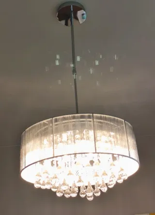 Elegante lámpara colgante para comedor o salón. Su diseño moderno y sofisticado aportará un toque de distinción a tu hogar. - Acabado en tono plateado. - Detalles de cristal. - Estructura metálica. - 11 bombillas Led con tres niveles de intensidad.