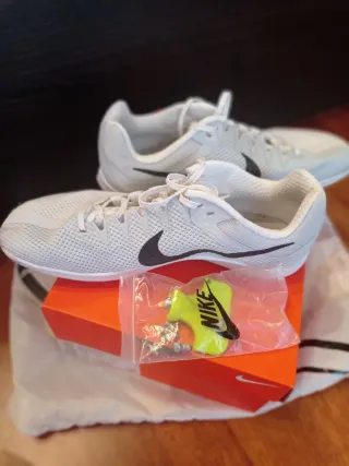 Zapatillas de atletismo Nike en tonos grises y blancos con clavos. Zapatillas de fondo. Nike Rival Distance. - Diseño ligero y transpirable. - Cierre con cordones. - Incluye clavos y llave para su colocación. - Bolsa de transporte con logo de Nike. - Caja original El pie derecho tiene la puntera con rayones de la pista.