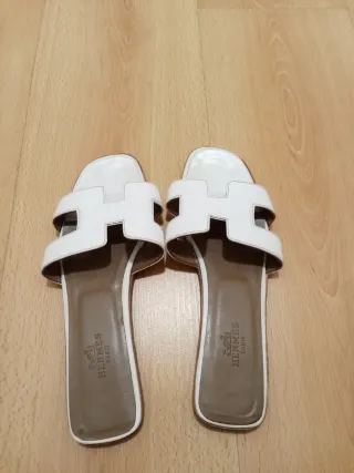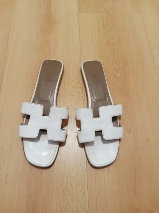 Elegantes sandalias de la marca Hermes Paris. - Diseño clásico con tira en H. - Color blanco y suela beige.