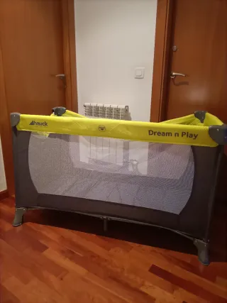 Cuna de viaje Hauck modelo Dream n Play, fácil de montar y transportar + colchón - Color gris con detalles en amarillo. - Laterales de malla para ventilación.