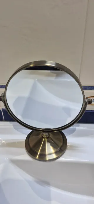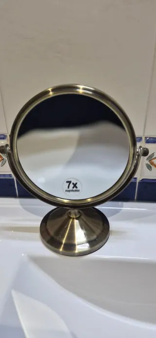Espejo de sobremesa con acabado metálico y diseño clásico. Ideal para el tocador o baño. - Ampliación 7x. - Base estable.