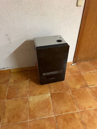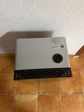 Estufa de gas con un diseño moderno y elegante, combinando acabados en negro y gris. Ideal para calentar espacios de forma eficiente. - Frontal de cristal. - Panel superior de plástico.