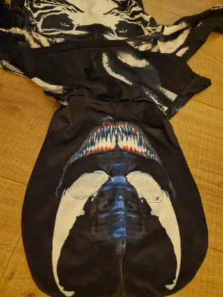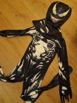 Disfraz de Venom para niños, perfecto para fiestas o Halloween. - Diseño inspirado en el personaje de Venom. - Incluye capucha con máscara. - Estampado detallado en negro y blanco.
