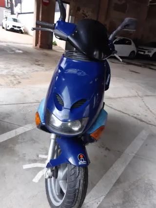 Scooter Aprilia SR 50 en color azul. Escape Yasuni para Aprilia SR 50. - Modelo Racing. - Fabricado en aluminio y negro. Se vende solo tiene rasguños en las partes laterales acaba de salir de taller el arranca funciona pero flojo supongo la batería todos los papeles en regla falta pasar itv precio negociable ‼️