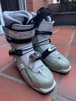Botas de esquí de travesía Scarpa, diseñadas para la montaña. 286 mm, para un 41 de pie - Cierre con hebillas y velcro. - Interior acolchado para mayor comodidad. - Marca Scarpa visible en la bota.