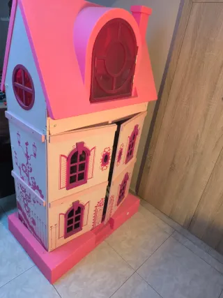 Preciosa casa de muñecas de color rosa, ideal para jugar. - Diseño de dos plantas con tejado. - Ventanas y puertas decoradas. - Base rosa. - Chimenea. Medidas 125 cm alto por 50 cm ancho